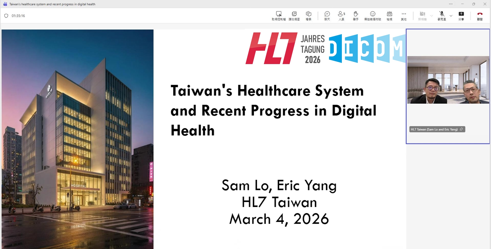 向國際與會者介紹台灣醫療體系的特色,以及近年在數位健康、醫療資訊交換與標準應用方面的重要進展與實務成果。
